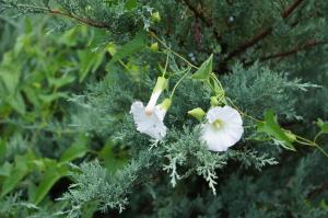 A first glance the white flowers in the picture to the left add beauty to the shrubbery; however, the white flowers are actually part of a nuisance vine that clings to the host plant and drains it of its strength.